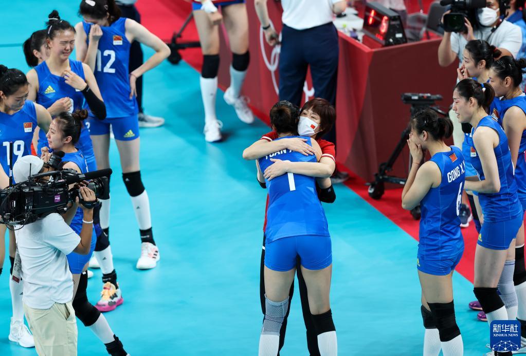 2021年8月2日,中國(guó)隊(duì)主教練郎平在比賽后與隊(duì)員一一擁抱。當(dāng)日,在東京奧運(yùn)會(huì)排球項(xiàng)目女排小組賽中,中國(guó)隊(duì)以3比0戰(zhàn)勝阿根廷隊(duì)。新華社記者 丁汀 攝