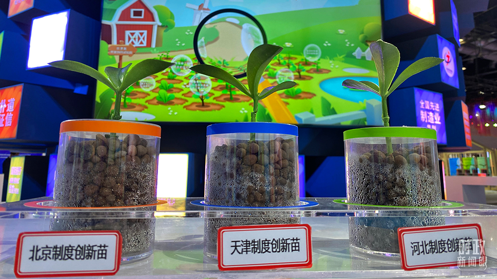 △京津冀三地“協同苗”亮相服貿會。這是一個互動裝置,觀眾可任意取下一棵放在操作臺感應區,了解京津冀三地開放創新舉措的內容、案例、配圖等。(總臺央視記者于海燕拍攝)