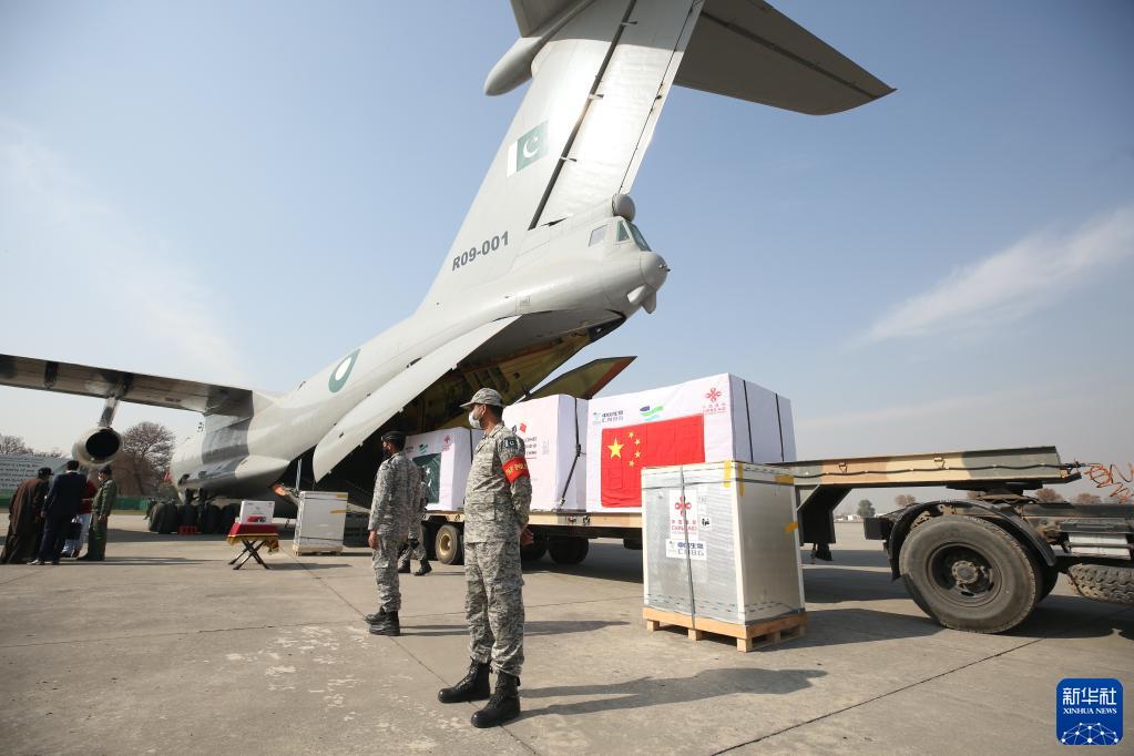 中國政府首批對外援助新冠疫苗在巴基斯坦首都伊斯蘭堡附近的努爾汗空軍基地正式移交巴基斯坦(2月1日攝)。新華社記者 劉天 攝