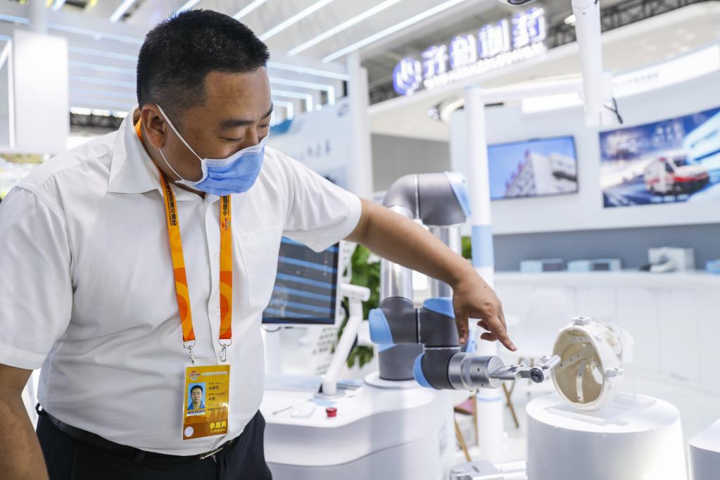 9月5日,在服貿(mào)會(huì)首鋼園區(qū)健康衛(wèi)生服務(wù)專題展北京宣武醫(yī)院展臺(tái),工作人員在介紹神經(jīng)外科手術(shù)機(jī)器人。(新華社記者張玉薇攝)