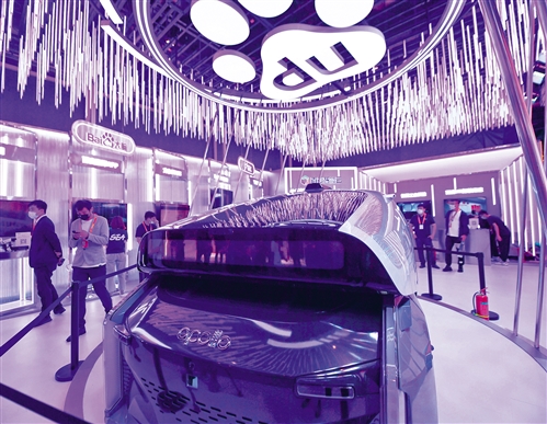 觀眾在2021年中國國際服務貿易交易會智慧交通服務展位“開往世界的列車”前拍照。服貿會是全球服務貿易領域規模最大、內容最豐富的國際展會,也是我國促進高水平對外開放的重要平臺。