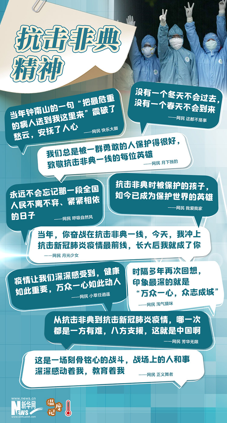 那一年,我們體會到了什么是萬眾一心。非典已經遠去,但中國人守望相助的情懷從未改變。正如有的網民在社交平臺上所說:“抗擊非典時被保護的孩子,如今已成為保護世界的英雄”“當年,你奮戰在抗擊非典一線,今天,我沖上抗擊新冠肺炎疫情最前線。”這就是代代傳承的精神,這就是融入血脈的力量。這精神力量,讓我們無所畏懼、堅強不屈,哪怕遇到驚濤駭浪,也必將穿越風雨、走向未來!(文字:馮文雅 海報設計:王曄)