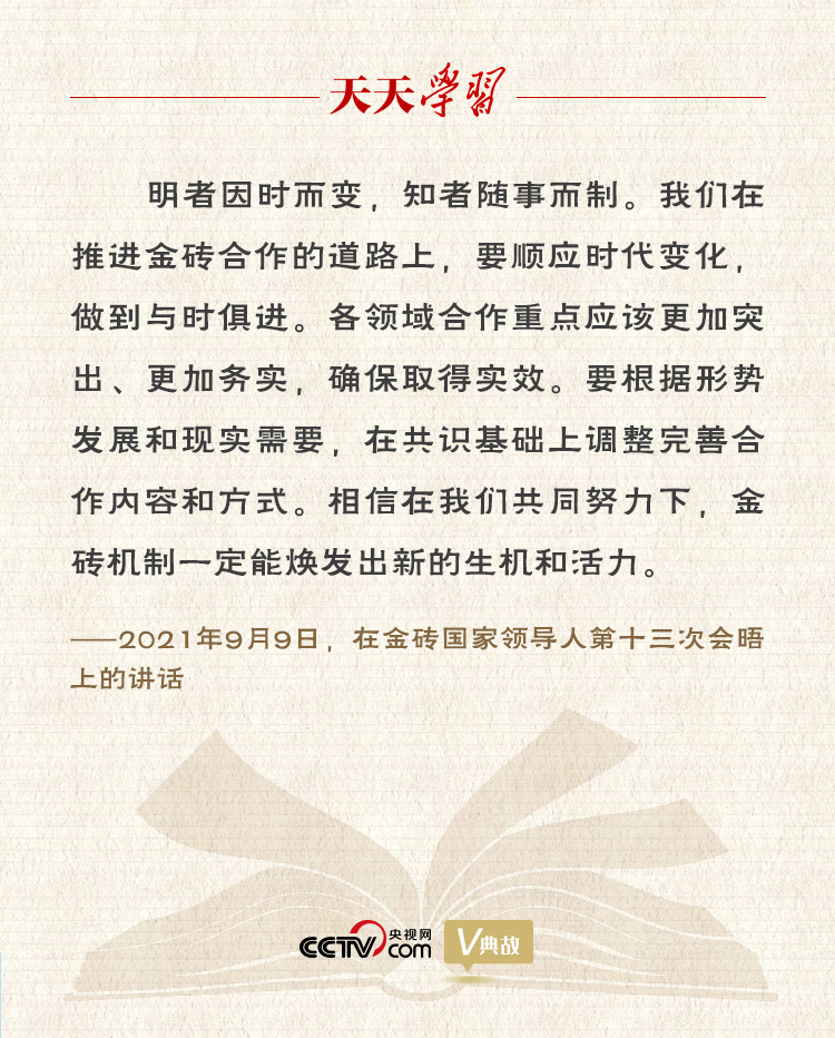 9月9日晚,金磚國家領導人第十三次會晤以視頻方式舉行。國家主席習近平發表題為《攜手金磚合作 應對共同挑戰》的重要講話,就推動金磚合作提出中國倡議、宣布務實舉措,為金磚合作注入新動力,為促進全球經濟復蘇帶來信心。在講話結尾,習近平主席引用古語“明者因時而變,知者隨事而制”,號召五國在推進金磚合作的道路上,要順應時代變化,做到與時俱進,為金磚國家加強更高質量務實合作指明了方向。
