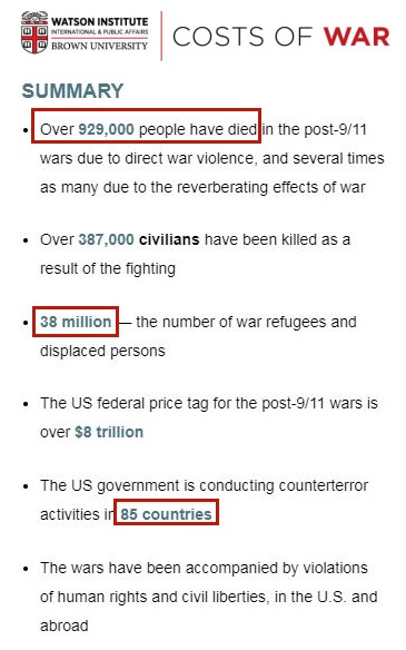 美國布朗大學的研究顯示,20年來,美國在全球85個國家發起的戰爭和軍事行動造成多達92.9萬人死亡,至少3800萬人流離失所。這還只是“非常保守的估計”。而由此引發的大量侵犯人權暴行更是難以勝數。