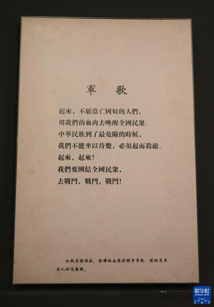 在東北抗日義勇軍紀念館拍攝的孫銘武、孫耀祖創作的《血盟救國軍軍歌》歌詞(7月21日攝)。新華社記者 蔡湘鑫 攝