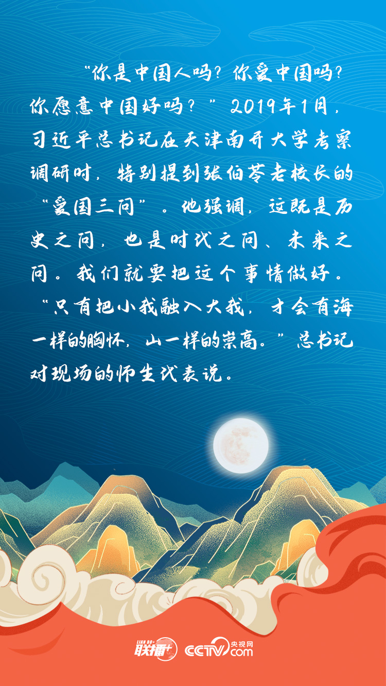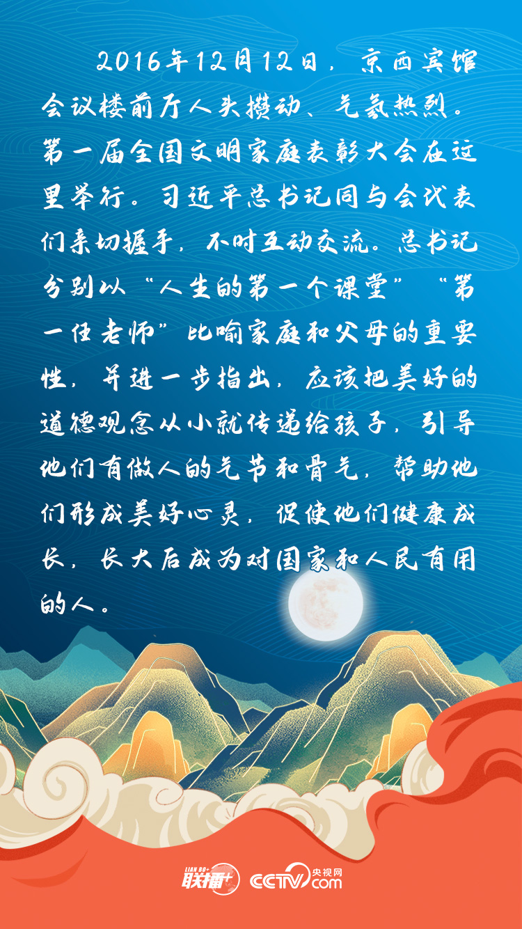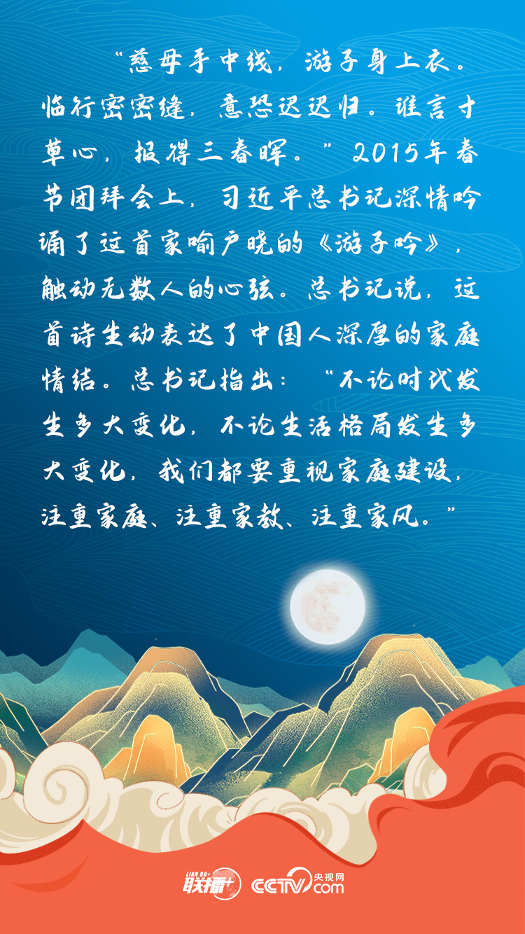 家是最小國,國是千萬家。黨的十八大以來,習(xí)近平總書記多次強(qiáng)調(diào)要重視家庭建設(shè),提倡把愛家和愛國統(tǒng)一起來,把實現(xiàn)個人夢、家庭夢融入國家夢、民族夢之中。中秋佳節(jié)即將到來之際,央視網(wǎng)《聯(lián)播+》欄目為您擷取總書記闡釋家國情懷的小故事,與您一起感受總書記心中的家國情。