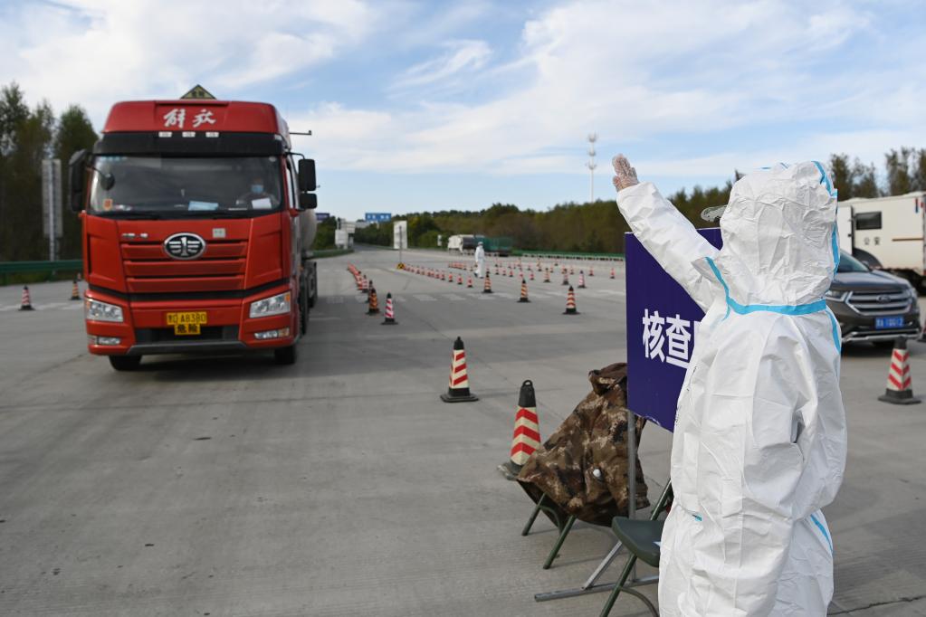 在哈爾濱一高速公路出城口,工作人員示意停車準備檢查車內(nèi)人員的核酸檢測報告(9月23日攝)。新華社記者王建威攝