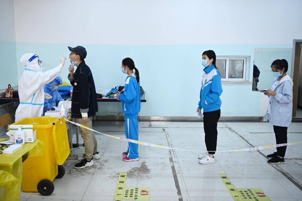 9月23日,在哈爾濱市香坊區(qū)一核酸檢測點,市民在排隊進行核酸檢測。新華社記者王建威攝