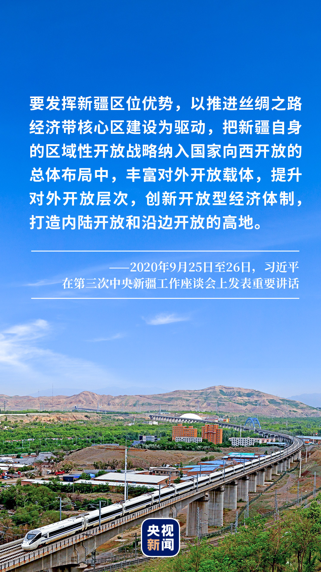 2020年9月25日至26日,第三次中央新疆工作座談會在北京召開,習近平總書記發表重要講話強調,要努力建設團結和諧、繁榮富裕、文明進步、安居樂業、生態良好的新時代中國特色社會主義新疆。