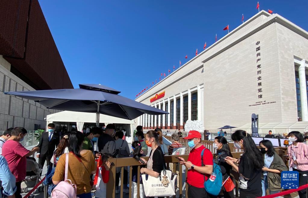 10月1日,人們在中國共產黨歷史展覽館入口處排隊入館。