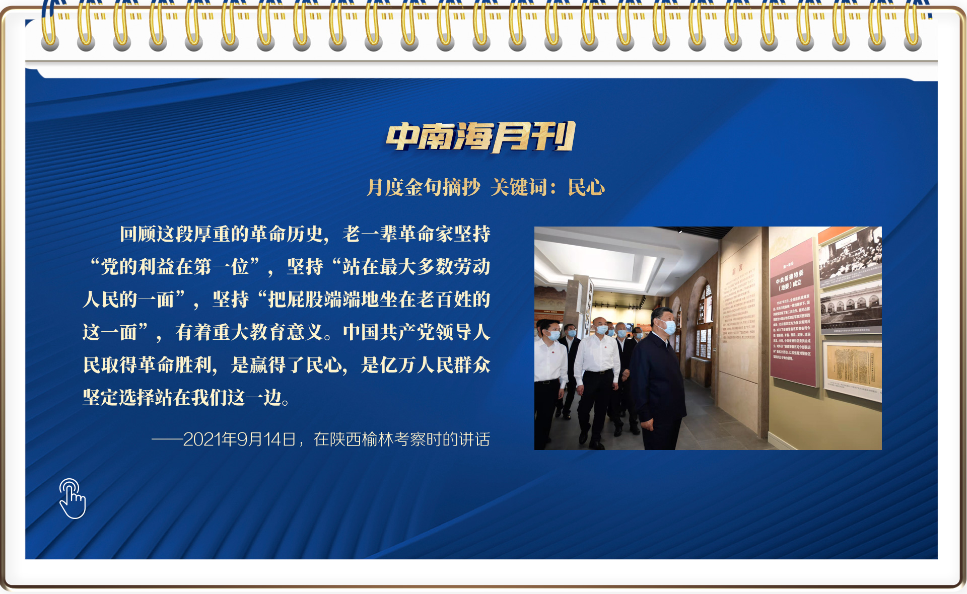 9月,一個個瞬間令人難忘:在中青年干部培訓班上講授“開班第一課”;在田間地頭同陜北老鄉拉家常;在革命舊址追憶革命歷史;在第七十六屆聯合國大會一般性辯論、上海合作組織成員國元首理事會第二十一次會議等國際場合闡述中國主張、出席烈士紀念日向人民英雄敬獻花籃儀式深情瞻仰人民英雄紀念碑……