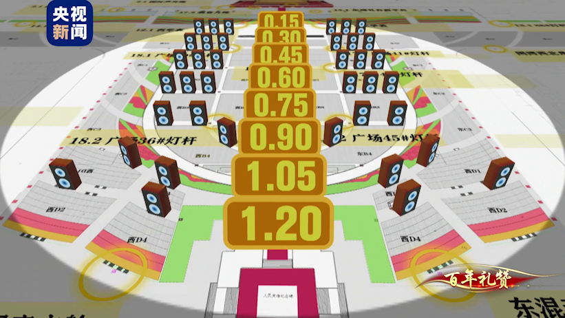 以廣場最北側的第一排音箱作為基線,音響團隊按照從北往南的順序,將每個觀眾方陣前的音箱發聲設置為要比前一排音箱延時0.15秒后再發聲。這就意味著最后一排音箱的發聲比第一排音箱延時發聲約1.2秒。這就保證了七一當天無論坐在哪個方陣的觀眾,當其他任意位置的音箱聲音傳到他所在方陣的時候,他面前的這排音箱也正好開始出聲。保證了各個音箱之間不發生聲音相互干擾,同時也讓現場的每一位觀眾都能聽到清晰飽滿的聲音。(總臺央視記者 侯軍 李文杰 劉潔 周培培 王瑞寧 曾文甫)