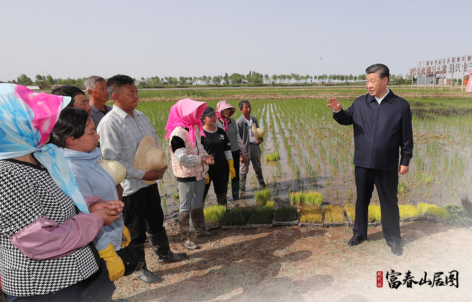 2020年6月9日,習近平總書記在寧夏回族自治區銀川市賀蘭縣稻漁空間鄉村生態觀光園,同正在勞作的村民親切交談。