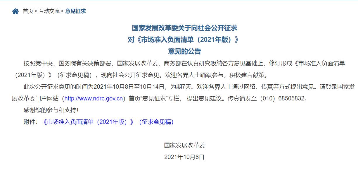 中新網(wǎng)10月9日電 據(jù)國家發(fā)改委網(wǎng)站消息,國家發(fā)改委8日就《市場準入負面清單(2021年版)》向社會公開征求意見。征求意見稿提及,禁止違規(guī)開展新聞傳媒相關業(yè)務。