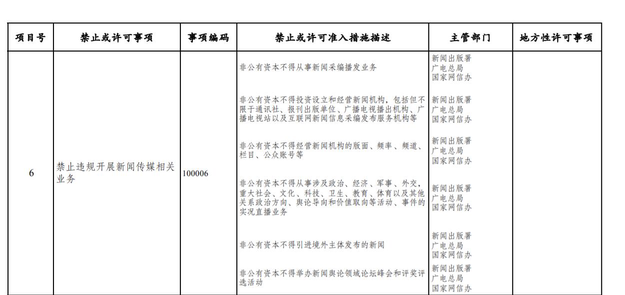2、非公有資本不得投資設立和經(jīng)營新聞機構,包括但不限于通訊社、報刊出版單位、廣播電視播出機構、廣播電視站以及互聯(lián)網(wǎng)新聞信息采編發(fā)布服務機構等。
