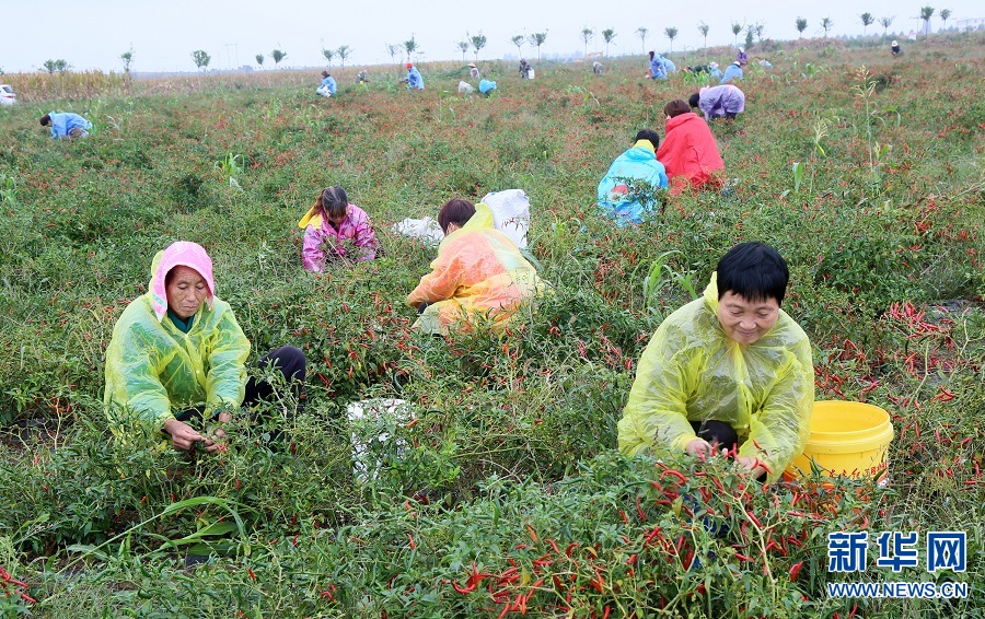 10月5日,河南省洛陽市汝陽縣蔡店鄉孟腦村千畝辣椒種植基地,村民在搶收辣椒。