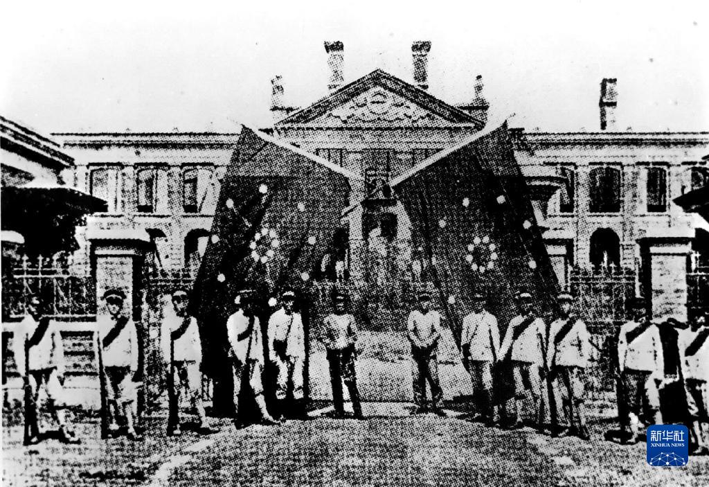 圖為革命軍占領(lǐng)武昌城后,軍政府掛起象征十八省團(tuán)結(jié)一致的十八星軍旗(資料照片)。