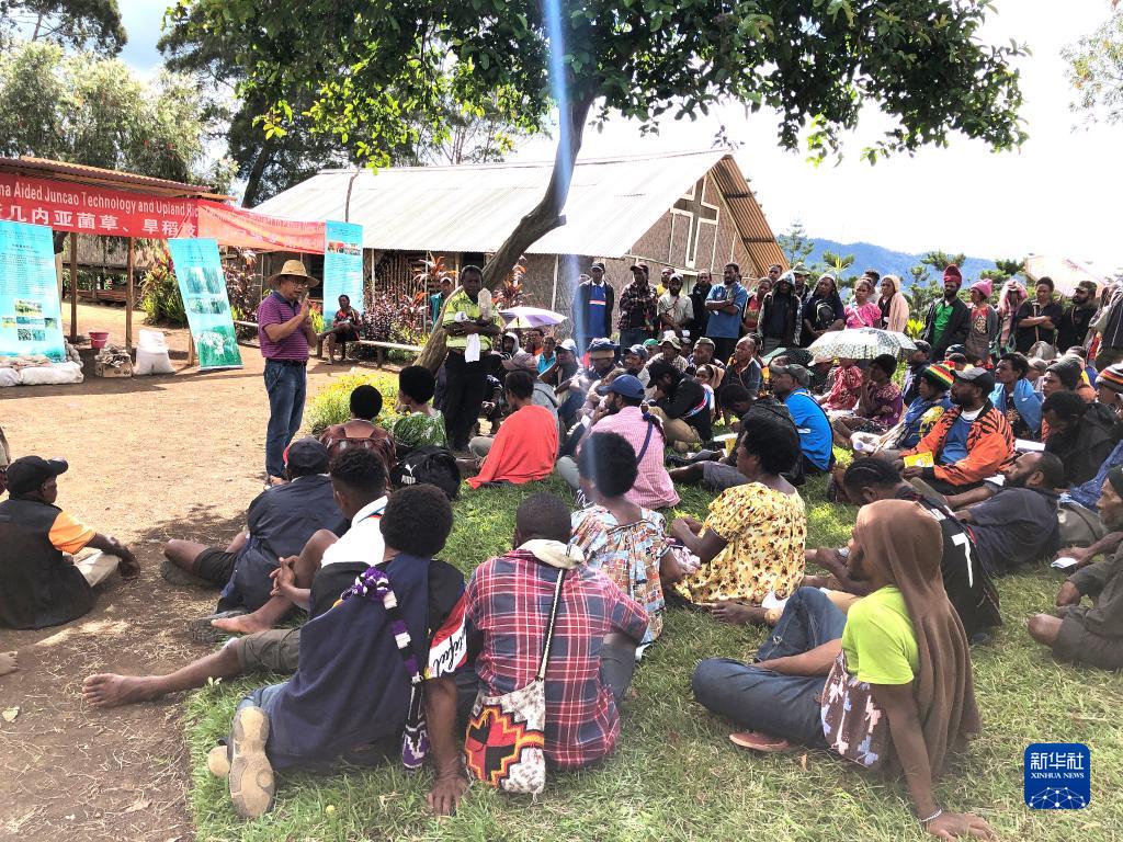 2020年12月15日,中國援巴布亞新幾內亞菌草旱稻項目專家組組長林應興(戴草帽者)在巴布亞新幾內亞東高地省中國援助巴新菌草和旱稻技術項目第9期培訓班上授課。新華社發