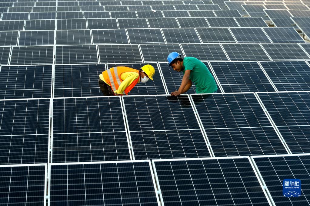 2021年1月3日,在位于孟加拉國首都達卡郊區的利德成集團廠區,工人們在房頂組裝光伏模組。從2020年開始,中資制衣類企業——利德成集團在其位于孟加拉國達卡的廠區內建設光伏電站,以降低對傳統能源的依賴,減少碳排放,從綠色發展的角度助力“一帶一路”建設。新華社發