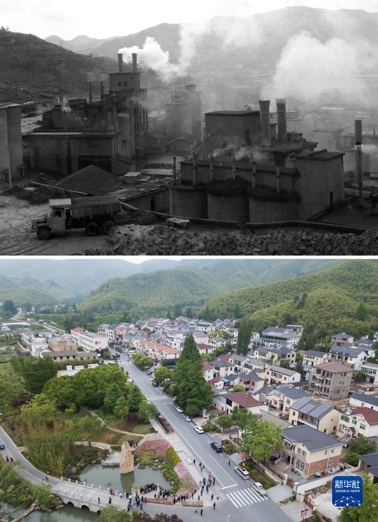 這是一張拼版照片,上圖為:浙江省湖州市安吉縣天荒坪鎮余村二十世紀八十年代的資料照片;下圖為:2018年4月24日,游客在整修一新的余村游覽(新華社記者翁忻旸攝)。新華社發
