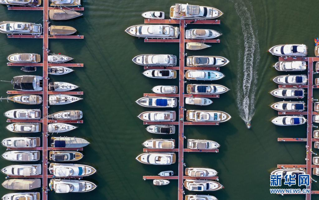 這是在三亞鴻洲國際游艇會碼頭停靠的游艇(2020年3月11日攝,無人機照片)。新華社記者 郭程 攝