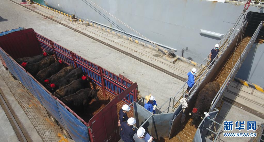 裝載來自澳大利亞的進口活牛貨船抵達海南馬村港后,工作人員在接卸活牛(2020年7月3日攝,無人機照片)。新華社記者 楊冠宇 攝