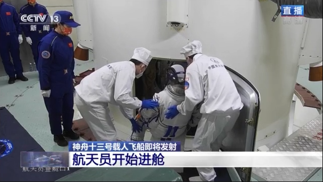 3名航天員陸續通過飛船軌道艙進入返回艙。