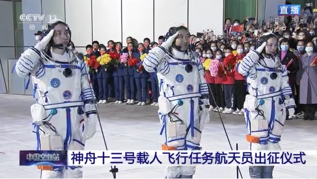 神舟十三號載人飛行任務航天員乘組出征儀式,在酒泉衛星發射中心問天閣廣場舉行。