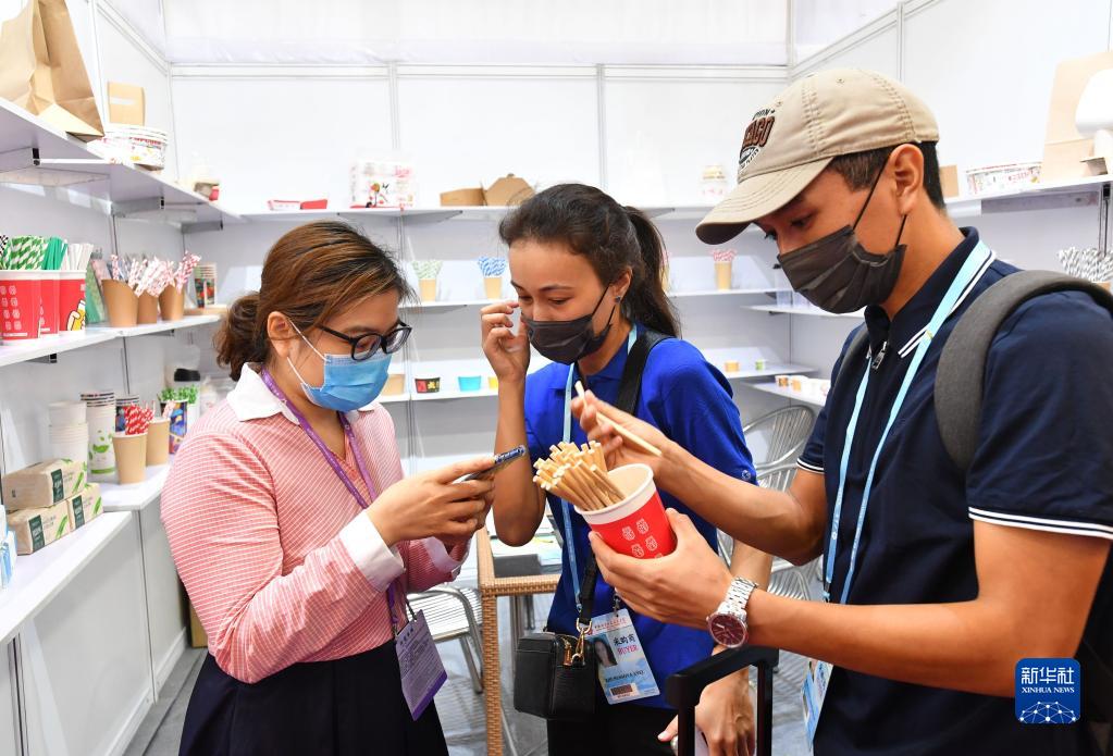 10月15日,兩名來自哈薩克斯坦的采購商(右、中)在第130屆廣交會環保吸管展臺洽談。新華社記者 劉大偉 攝
