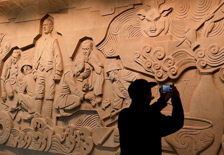 參觀者在仰韶文化博物館內(nèi)拍攝浮雕(10月15日攝)。新華社記者 李安 攝