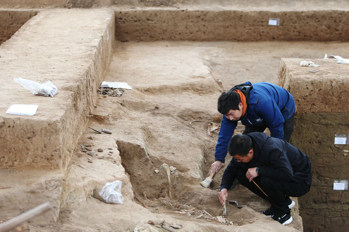 工作人員在仰韶村遺址第四次考古發(fā)掘現(xiàn)場作業(yè)(10月15日攝)。新華社記者 許雅楠 攝