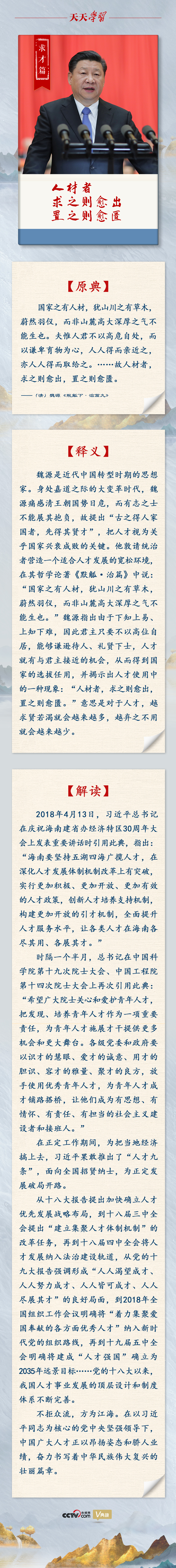 編者按:中央人才工作會議9月27日至28日在北京召開,習近平總書記出席會議并發表重要講話。黨的十八大以來,總書記站在黨和國家事業發展全局的戰略高度,對我國人才事業發展作出一系列重要指示。在講話和文章中,他大量引用有關中國古代人才思想的典故,就如何選才、敬才、求才、育才、用才等話題,提出了一系列新思想、新觀點、新論斷、新要求,為新時代做好人才工作提供了根本遵循和行動指南!短焯鞂W習》帶您一起學習回顧。