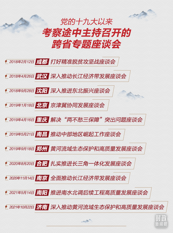 《時政新聞眼》梳理發現,加上這次座談會,黨的十九大以來,習近平總書記在考察途中一共主持召開了11場跨省座談會。除了3場聚焦脫貧攻堅、南水北調外,其他8場關注的都是區域協調發展的重大戰略和部署。