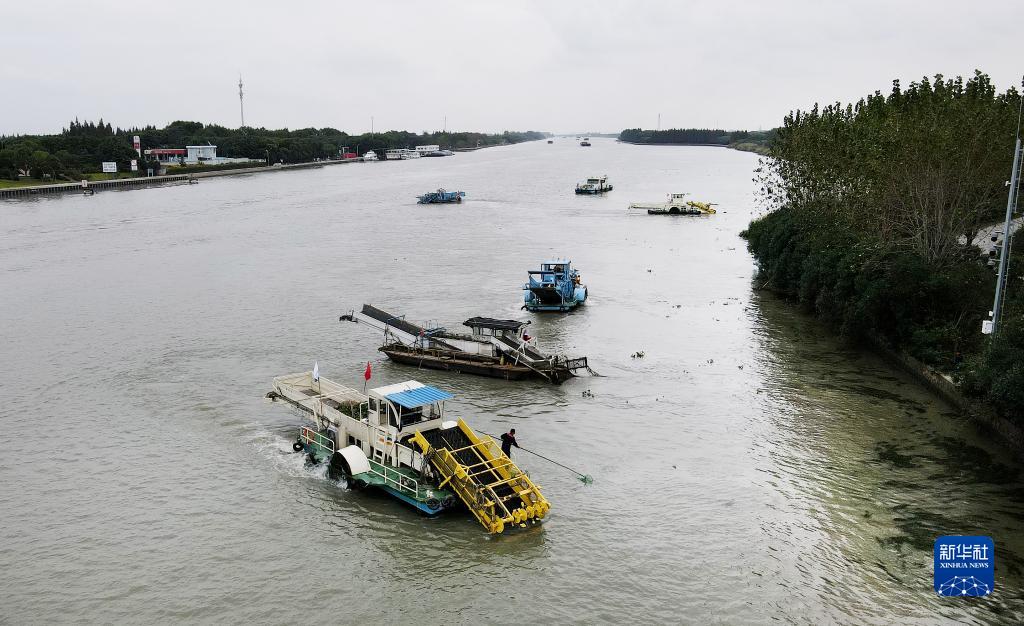 2020年10月15日,蘇浙滬三地的保潔船在太浦河水域聯(lián)合清理水面浮游植物(無人機(jī)照片)。新華社記者 方喆 攝