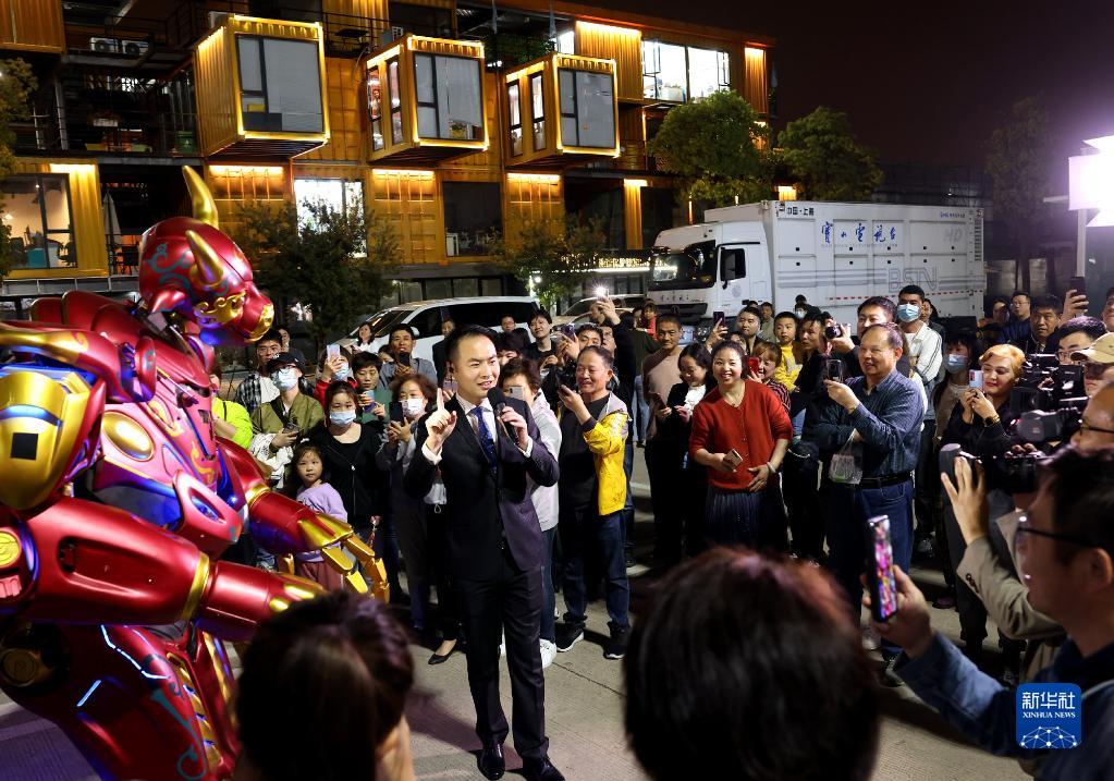 2021年4月30日,消費(fèi)者在上海市智慧灣“五五購物節(jié)”活動(dòng)現(xiàn)場(chǎng)了解導(dǎo)購機(jī)器人。新華社記者 陳飛 攝