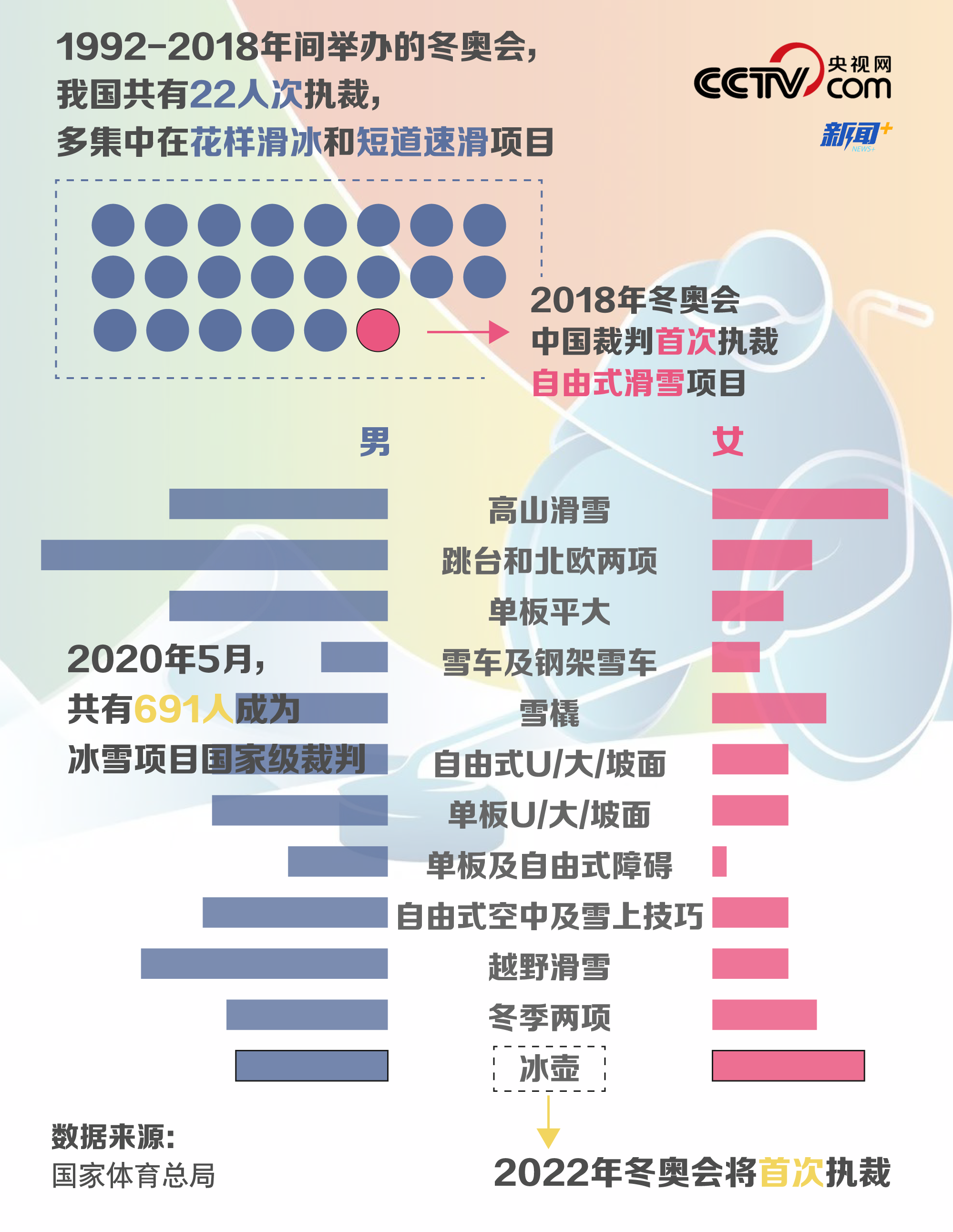 除了選手們?cè)谫悎?chǎng)上大放異彩,冬奧會(huì)賽場(chǎng)上的裁判席也開(kāi)始出現(xiàn)“中國(guó)身影”。據(jù)統(tǒng)計(jì),1992-2018年的冬奧會(huì)中,我國(guó)共有22人次擔(dān)任裁判,2018年的冬奧賽場(chǎng)上出現(xiàn)首位自由式滑雪空中技巧項(xiàng)目的中國(guó)裁判。為更好地做好冰雪項(xiàng)目競(jìng)賽工作,體育總局冬運(yùn)中心于2020年5月授予691人冰雪項(xiàng)目國(guó)家級(jí)裁判員稱(chēng)號(hào),其中多為雪上項(xiàng)目裁判員。值得一提的是,2022年冬奧會(huì)將有4名中國(guó)冰壺裁判首次執(zhí)裁。