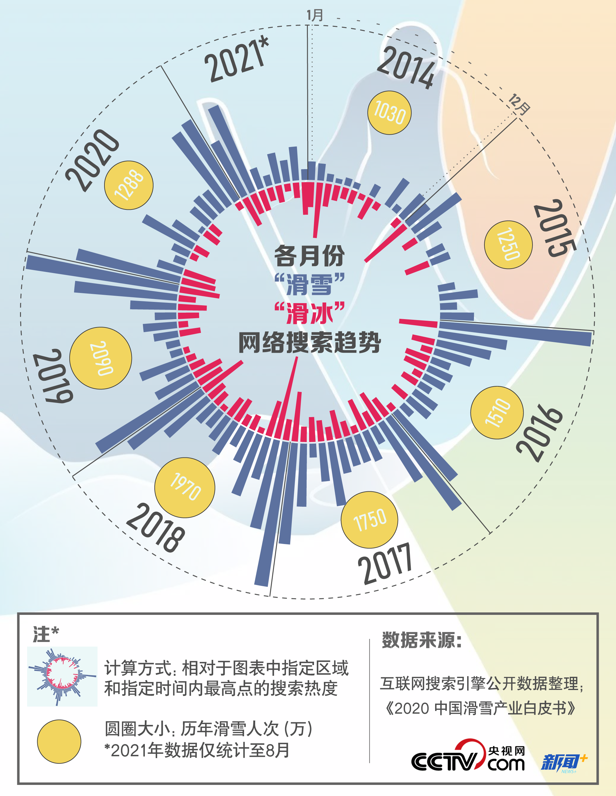 據(jù)央視網(wǎng)統(tǒng)計(jì),自2016年起,公眾在互聯(lián)網(wǎng)搜索“滑雪”“滑冰”等冰雪項(xiàng)目的頻次明顯上升,且多集中在11月、12月和次年1月。除2020年受疫情防控的影響外,實(shí)際參與滑雪項(xiàng)目的群眾也逐年增多,2019年參與滑雪運(yùn)動(dòng)的人次是2014年的二倍。