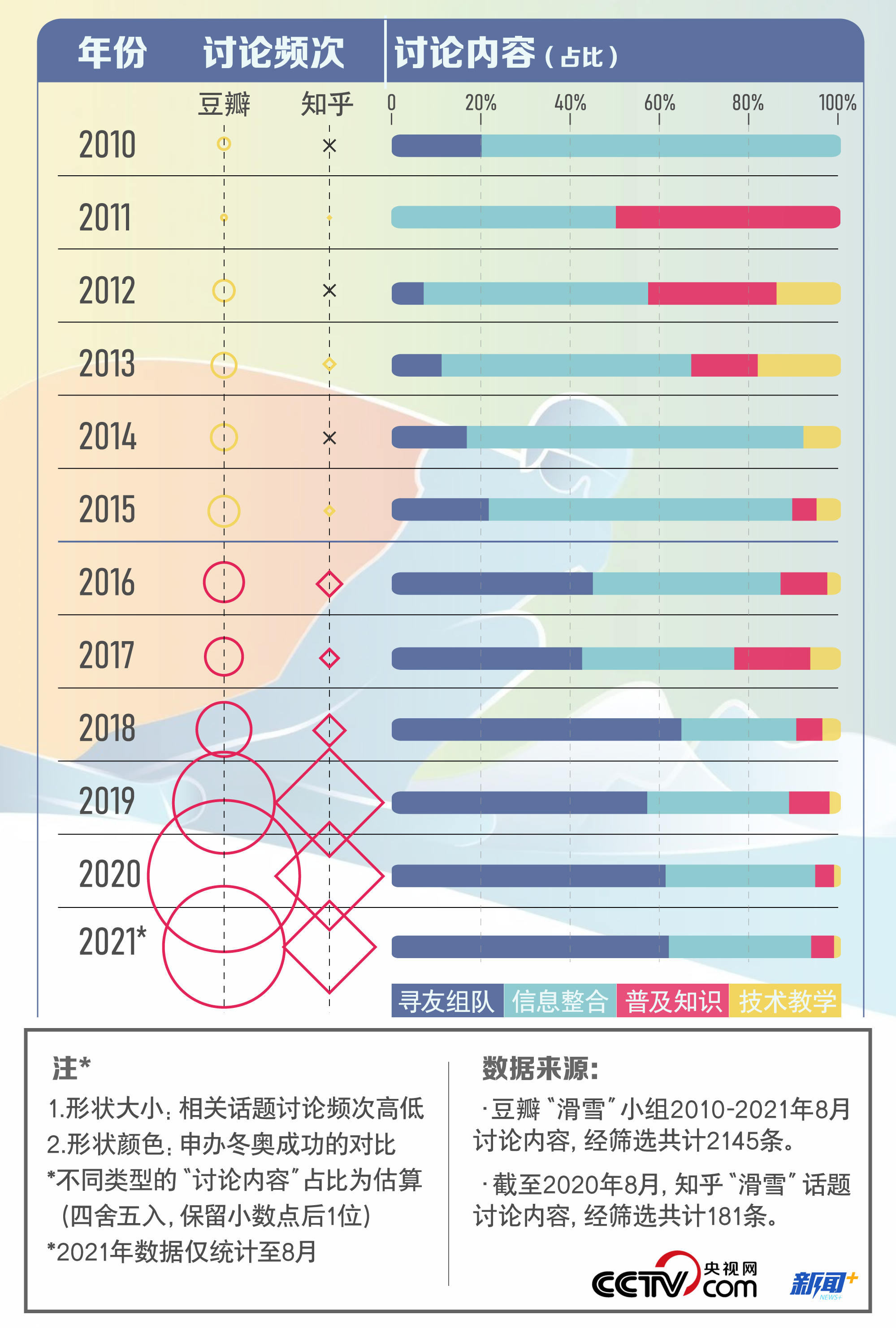 此外,人們對(duì)冰雪運(yùn)動(dòng)關(guān)注和討論的內(nèi)容也悄然改變。統(tǒng)計(jì)發(fā)現(xiàn),隨著中國(guó)互聯(lián)網(wǎng)的發(fā)展,2016年開(kāi)始,“滑雪”在網(wǎng)絡(luò)平臺(tái)的討論頻次較前五年相比明顯增加,“尋友組隊(duì)”成為大部分愛(ài)好者的第一需求,而且討論的內(nèi)容也更為豐富多元,側(cè)面反映了滑雪項(xiàng)目正逐漸脫離“小眾”,走向“大眾”。