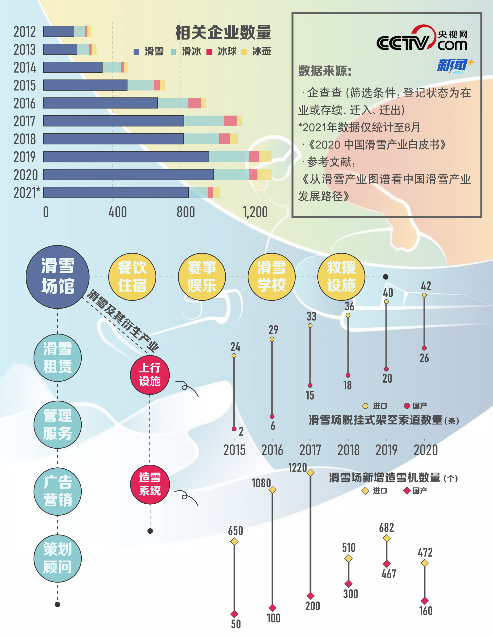 大眾對(duì)于冰雪運(yùn)動(dòng)的衍生需求給冰雪產(chǎn)業(yè)的發(fā)展奠定了一定基礎(chǔ)。近幾年,中國(guó)冰雪產(chǎn)業(yè)蓬勃發(fā)展,相關(guān)企業(yè)數(shù)量呈明顯上升趨勢(shì),2020年僅“滑雪”類(lèi)企業(yè)數(shù)量就超過(guò)2016年四類(lèi)冰雪企業(yè)數(shù)量總和。同時(shí),我國(guó)冰雪產(chǎn)業(yè)規(guī)模擴(kuò)大、覆蓋范圍也變廣,國(guó)產(chǎn)品牌逐漸“嶄露頭角”。比如國(guó)產(chǎn)脫掛式架空索道的發(fā)展勢(shì)頭迅猛,從2015年僅有個(gè)位數(shù)增長(zhǎng)到2020年的26條,此外國(guó)產(chǎn)造雪機(jī)也正代替進(jìn)口商品被雪場(chǎng)經(jīng)營(yíng)方使用。由此可見(jiàn),人們對(duì)于冰雪的喜愛(ài)不僅表現(xiàn)在“直接參與”,還間接推動(dòng)了衍生產(chǎn)業(yè)的發(fā)展。