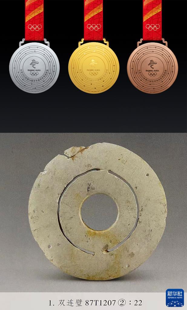 拼版照片:上圖為10月26日發布的北京冬奧會獎牌(背面)(北京冬奧組委供圖);下圖為凌家灘遺址出土的雙連璧(凌家灘遺址管理處供圖)。