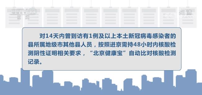 對14天內曾到訪有1例及以上本土新冠病毒感染者的縣所屬地級市其他縣人員,按照進京需持48小時內核酸檢測陰性證明相關要求,“北京健康寶”自動比對核酸檢測記錄。