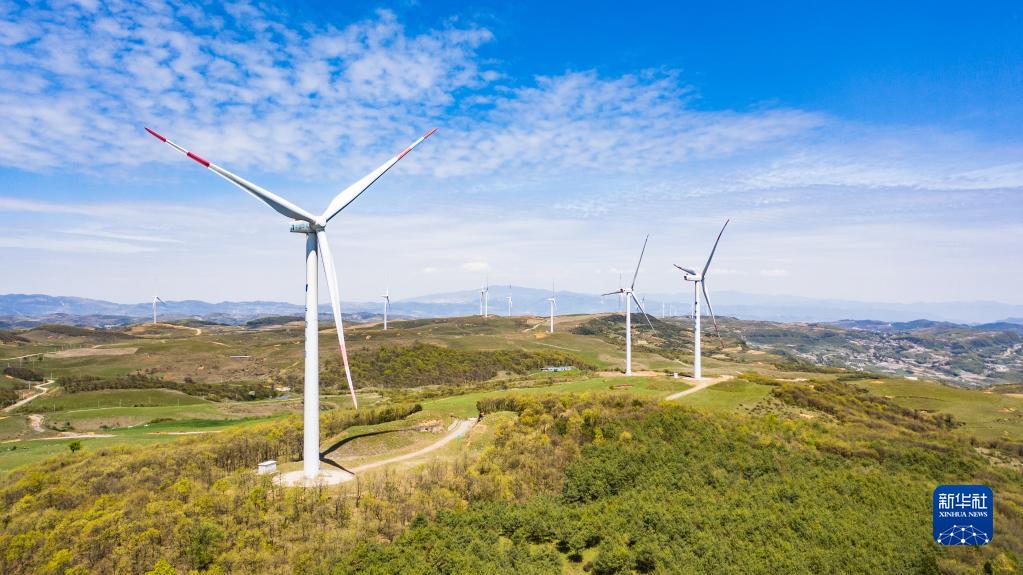 貴州省威寧彝族回族苗族自治縣雪山鎮的風力發電設備(2020年4月27日攝,無人機照片)。新華社記者 陶亮 攝