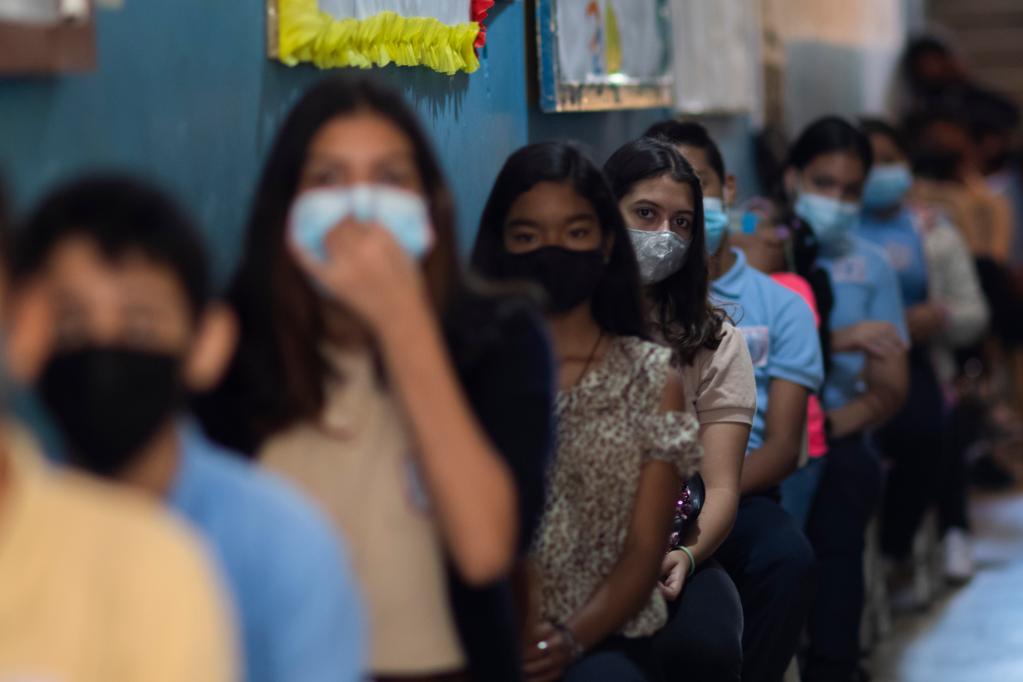 11月4日,在位于委內瑞拉首都市中心的“何塞·安潔爾·阿拉莫”中學,學生們在排隊接種中國疫苗。薩爾戈多攝
