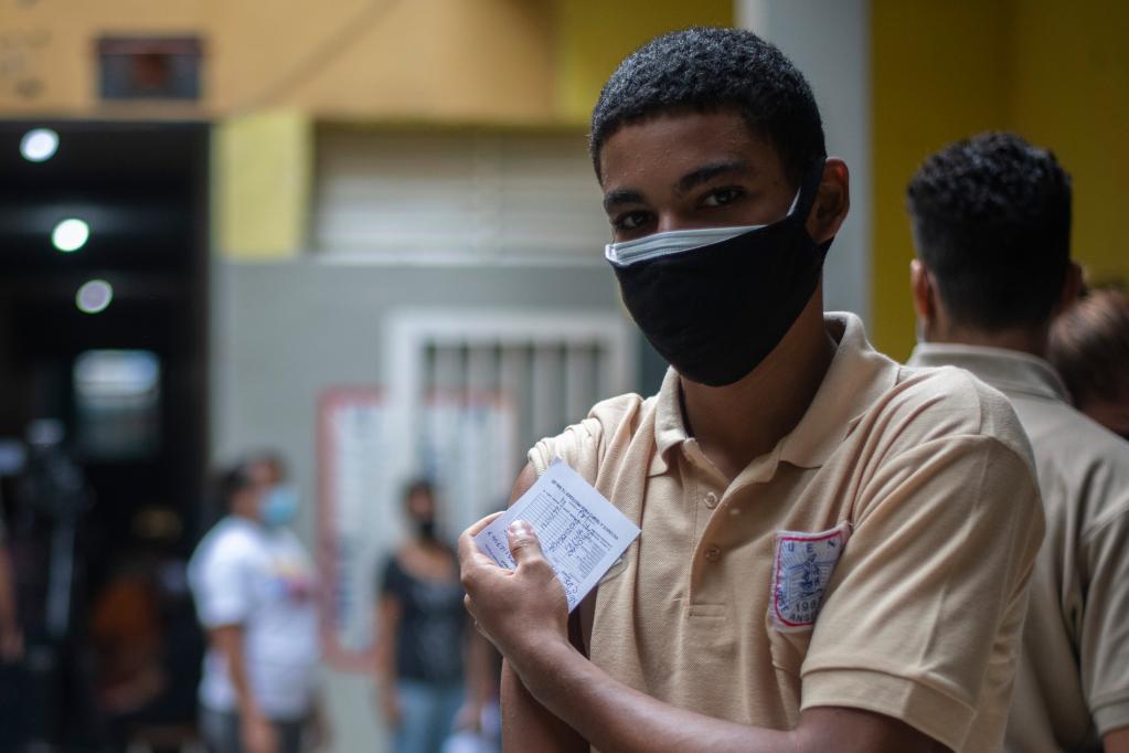 11月4日,在位于委內瑞拉首都市中心的“何塞·安潔爾·阿拉莫”中學,一名學生們在接種中國疫苗。薩爾戈多攝