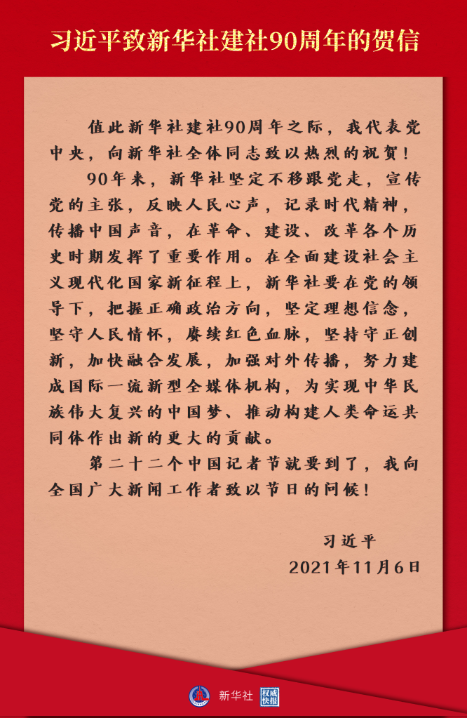 今年11月6日,在新華社建社90周年之際,習近平總書記專門致信祝賀,寄語新華社:要在黨的領導下,把握正確政治方向,堅定理想信念,堅守人民情懷,賡續紅色血脈,堅持守正創新,加快融合發展,加強對外傳播,努力建成國際一流新型全媒體機構。