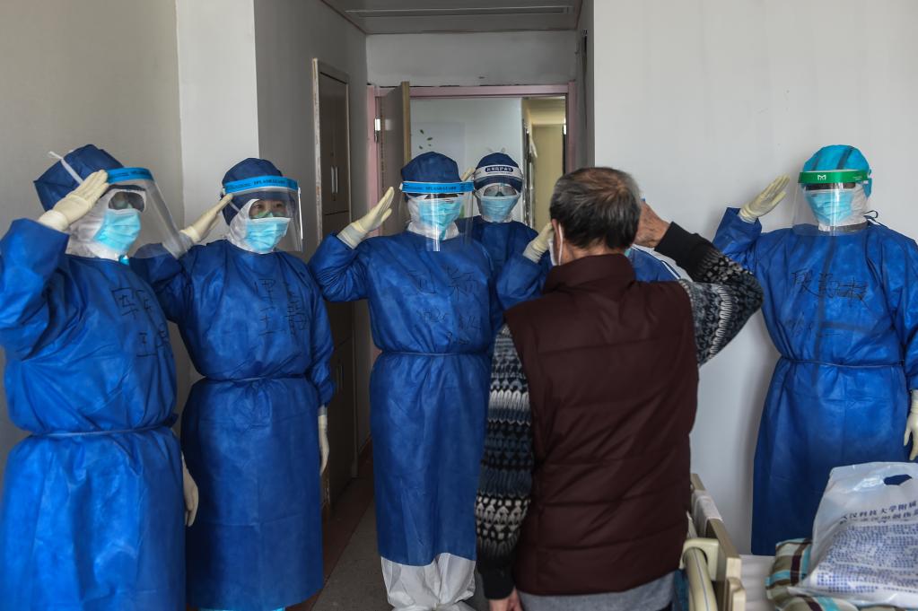 在中國湖北省婦幼保健院光谷院區,一名即將出院的老年患者向醫護人員致敬(2020年3月14日攝)。新華社發(趙佳慶攝)