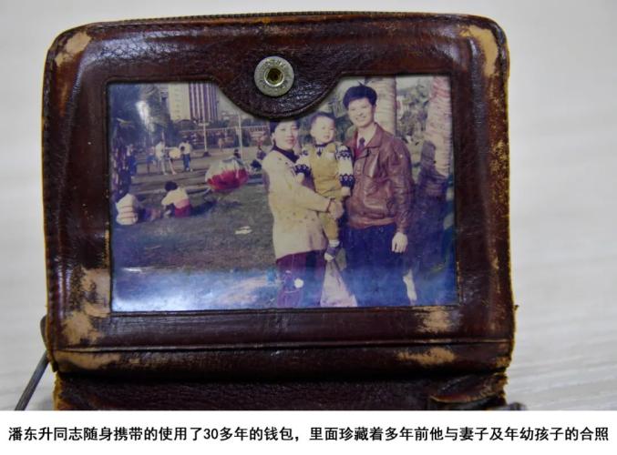 潘東升犧牲后,工作人員在整理他的遺物時(shí)找到了他隨身攜帶的錢包。錢包已破舊不堪,里面夾著他和妻子、兒子的合照。