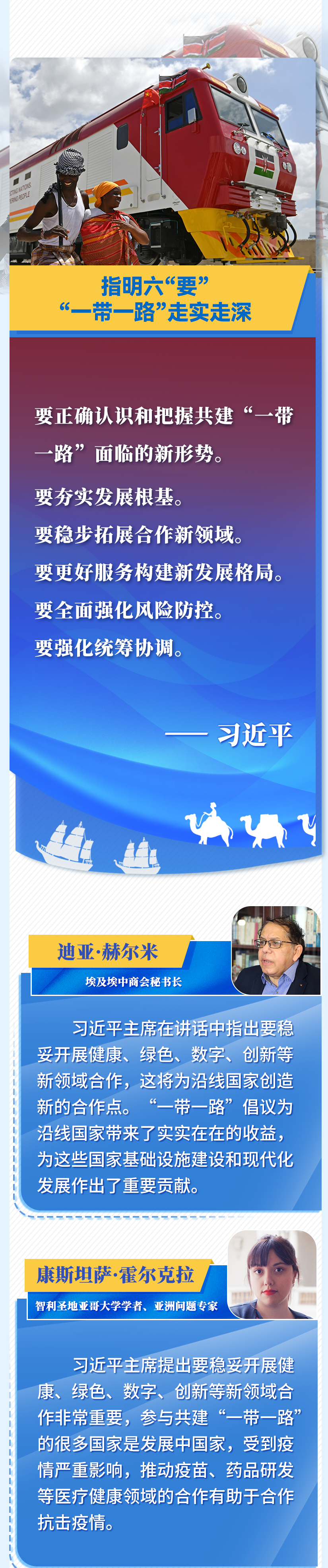 習近平指出,要正確認識和把握共建“一帶一路”面臨的新形勢。總體上看,和平與發展的時代主題沒有改變,經濟全球化大方向沒有變,國際格局發展戰略態勢對我有利,共建“一帶一路”仍面臨重要機遇。同時,世界百年未有之大變局正加速演變,新一輪科技革命和產業變革帶來的激烈競爭前所未有,氣候變化、疫情防控等全球性問題對人類社會帶來的影響前所未有,共建“一帶一路”國際環境日趨復雜。我們要保持戰略定力,抓住戰略機遇,統籌發展和安全、統籌國內和國際、統籌合作和斗爭、統籌存量和增量、統籌整體和重點,積極應對挑戰,趨利避害,奮勇前進。