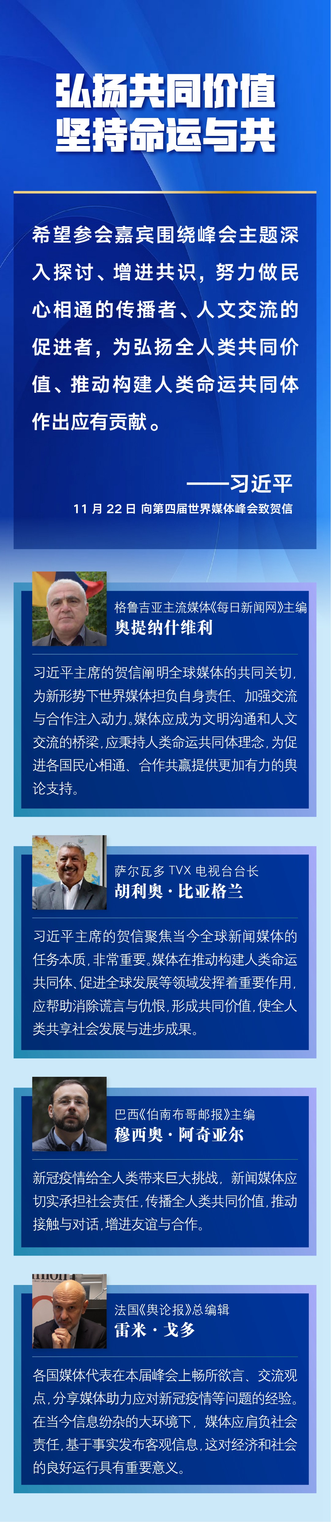 多國媒體人士認為,習近平主席的賀信對全球媒體更好肩負社會責任、廣泛凝聚世界共識作出重要闡述,為新形勢下世界媒體加強交流與合作、弘揚全人類共同價值、推動構建人類命運共同體注入新的推動力——