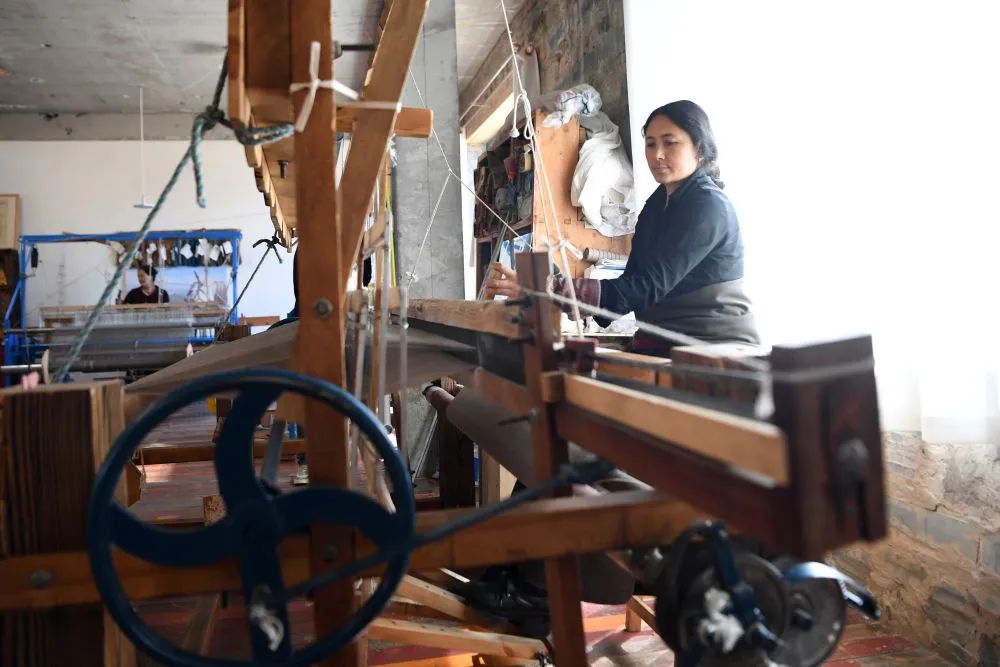 在甘肅省甘南藏族自治州夏河縣阿木去乎鎮(zhèn)加科村,村民周毛吉在車間使用傳統(tǒng)木式紡織機(jī)編織手工藝品(9月9日攝)。 新華社記者 陳斌 攝